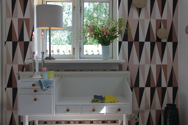 Tror der skal tapet fra Ferm på bagvæggen..Det nye møbel skal males i en super sart lysegul farve (måske pudder)