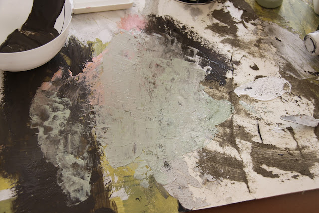 Pladen er lavet i lag. Først er pladen grundet. derefter er der skåret, slebet og revet pap stykker af den. Her blander jeg hvid og sort hobbymaling med en skalpel. Derefter er farverne spartlet rundt på pladen.